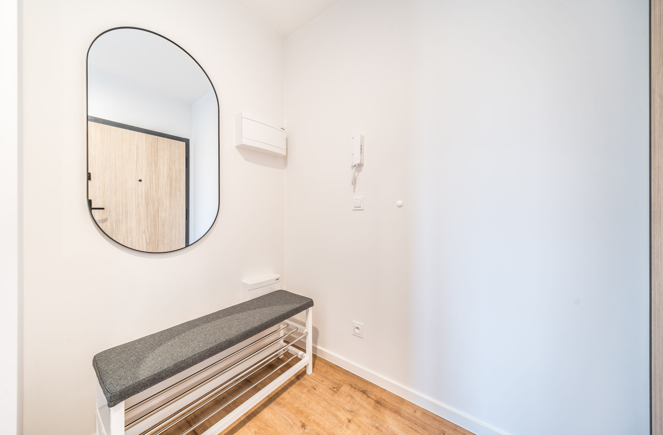 A furnished, fully equipped two-bedroom apartment is offered for rent in a newly constructed residential complex in the Naramowice district of Poznań. The apartment will be available for move-in from October 16, and the incoming tenant will be the first occupant. The apartment is in a newly built modern complex, and ready for moving in from October 16. You will be the first tenant to move in.