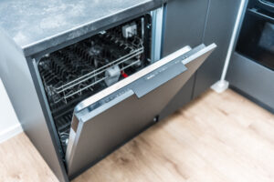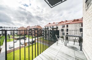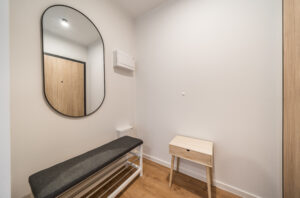 Układ mieszkania obejmuje pokój z aneksem kuchennym, osobną łazienkę z toaletą, bezpośrednie wyjście na prywatny balkon lub taras (w zależności od piętra) oraz niewielki przedpokój. Łazienka wyposażona jest w glazurę, wannę/prysznic, grzejnik na ręczniki, toaletę i umywalkę. W kuchni znajdują się: duża lodówka, płyta indukcyjna, piekarnik z funkcją mikrofali, zmywarka oraz okap. Mieszkanie umeblowane jest w rozkładaną sofę, pościel, stół z krzesłami, szafkę RTV, oświetlenie, szafę oraz meble ogrodowe.