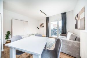 Do wynajęcia umeblowane, w pełni wyposażone studio w nowo wybudowanym kompleksie mieszkaniowym w dzielnicy Naramowice w Poznaniu. Apartament będzie dostępny do wprowadzenia się od 16 października, a przyszły najemca będzie pierwszym lokatorem.
