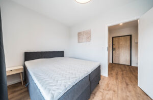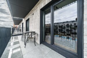 Układ apartamentu obejmuje pokój dzienny z aneksem kuchennym, osobną sypialnię, oddzielną łazienkę z toaletą, niewielki przedpokój oraz bezpośrednie wyjście na prywatny balkon lub taras (w zależności od piętra). Łazienka wyposażona jest w glazurę, wannę/prysznic, grzejnik na ręczniki, toaletę i umywalkę. W kuchni znajdują się: duża lodówka, płyta indukcyjna, piekarnik z funkcją mikrofali, zmywarka oraz okap.