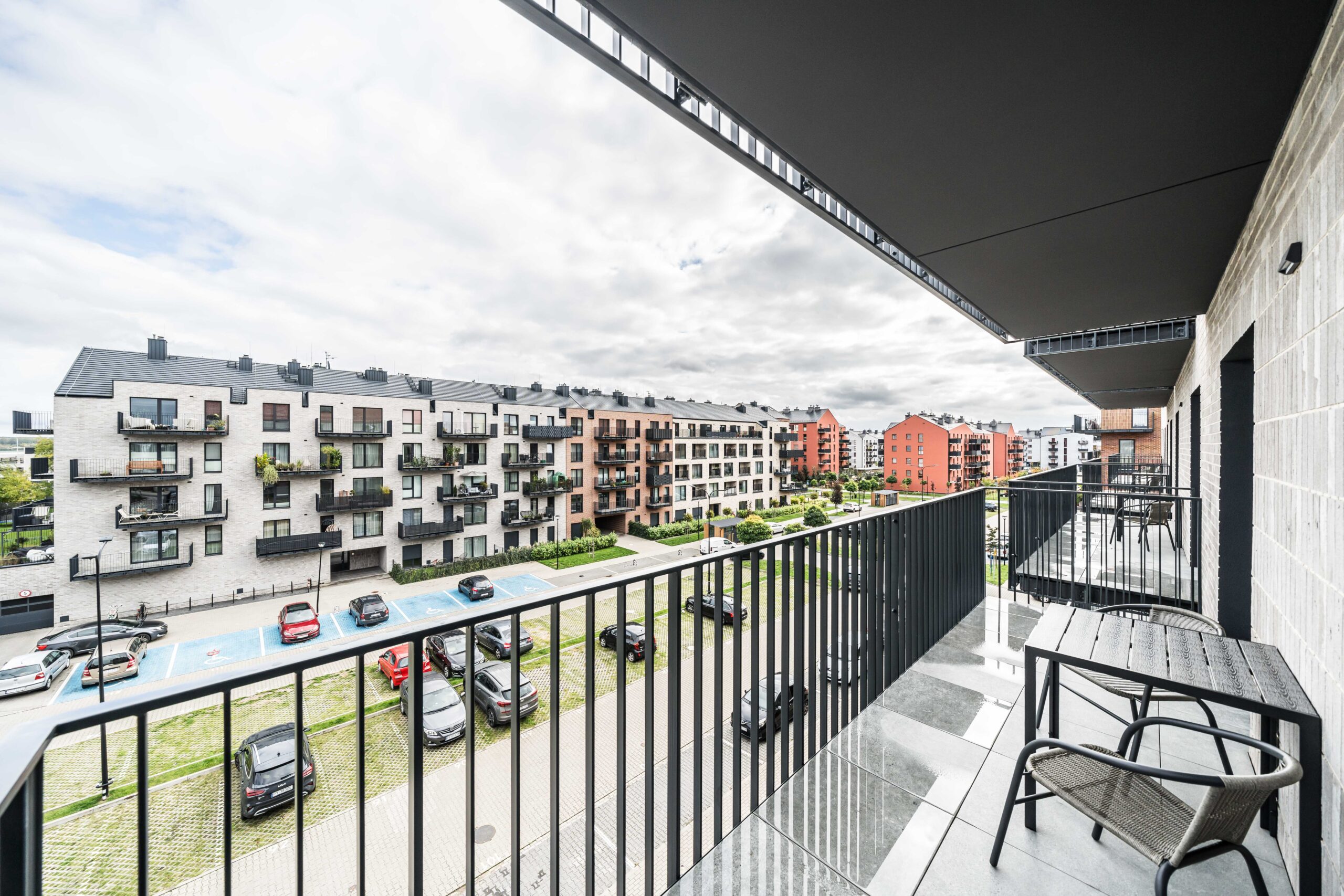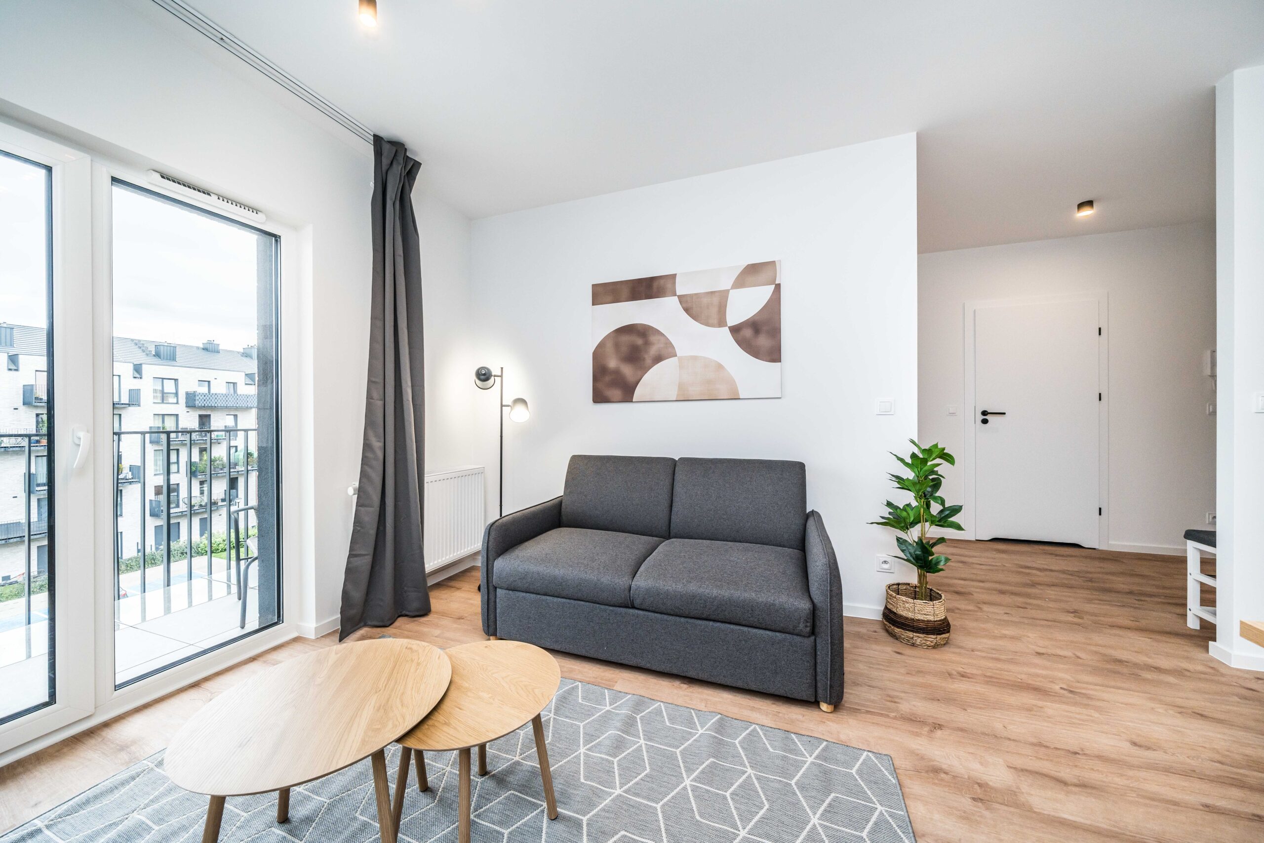 Układ apartamentu obejmuje pokój dzienny z aneksem kuchennym, osobną sypialnię, oddzielną łazienkę z toaletą, niewielki przedpokój oraz bezpośrednie wyjście na prywatny balkon lub taras (w zależności od piętra). Łazienka wyposażona jest w glazurę, wannę/prysznic, grzejnik na ręczniki, toaletę i umywalkę. W kuchni znajdują się: duża lodówka, płyta indukcyjna, piekarnik z funkcją mikrofali, zmywarka oraz okap.