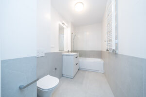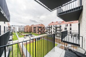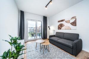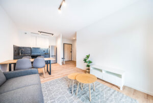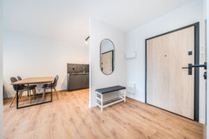 Układ apartamentu obejmuje pokój dzienny z aneksem kuchennym, osobną sypialnię, oddzielną łazienkę z toaletą, niewielki przedpokój oraz bezpośrednie wyjście na prywatny balkon lub taras (w zależności od piętra). Łazienka wyposażona jest w glazurę, wannę/prysznic, grzejnik na ręczniki, toaletę i umywalkę. W kuchni znajdują się: duża lodówka, płyta indukcyjna, piekarnik z funkcją mikrofali, zmywarka oraz okap.