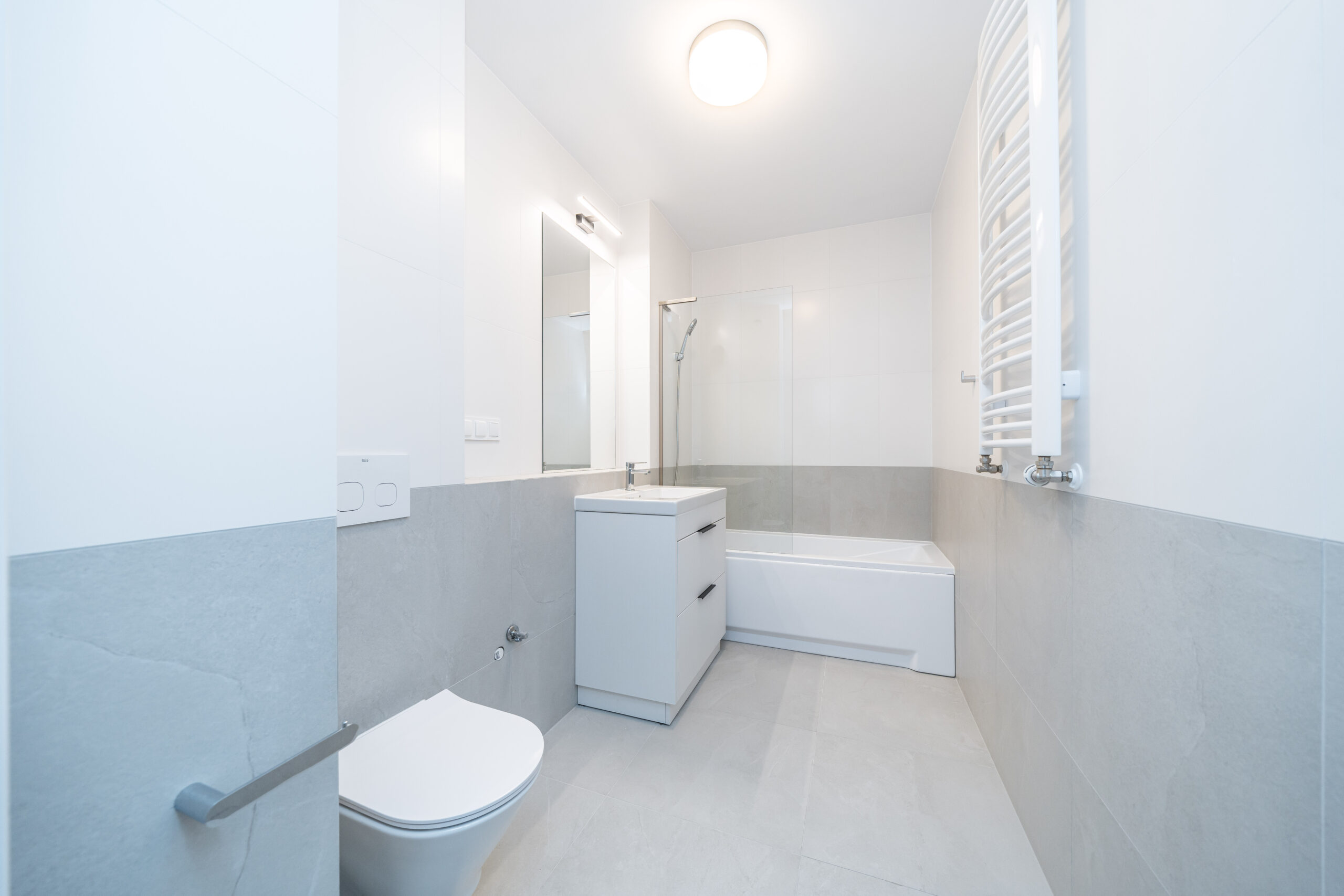 Układ apartamentu obejmuje pokój dzienny z aneksem kuchennym, osobną sypialnię, oddzielną łazienkę z toaletą, niewielki przedpokój oraz bezpośrednie wyjście na prywatny balkon lub taras (w zależności od piętra). Łazienka wyposażona jest w glazurę, wannę/prysznic, grzejnik na ręczniki, toaletę i umywalkę. W kuchni znajdują się: duża lodówka, płyta indukcyjna, piekarnik z funkcją mikrofali, zmywarka oraz okap.