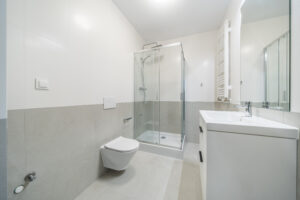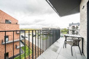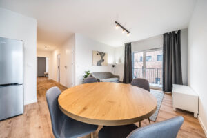 Układ apartamentu obejmuje pokój dzienny z aneksem kuchennym, oddzielną sypialnię, osobną łazienkę z toaletą, niewielki przedpokój oraz bezpośrednie wyjście na prywatny balkon lub taras (w zależności od piętra). Łazienka wyposażona jest w glazurę, wannę/prysznic, grzejnik na ręczniki, toaletę i umywalkę. W kuchni znajdują się: duża lodówka, płyta indukcyjna, piekarnik z funkcją mikrofali, zmywarka oraz okap.
