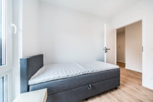 Apartament umeblowany jest w rozkładaną sofę, pojedyncze łóżko typu boxspring, dwuosobowe łóżko typu boxspring, pościel, stół z krzesłami, szafkę RTV, oświetlenie, dużą i małą szafę oraz meble ogrodowe. Dostępne są różne apartamenty o powierzchni od 52 m² do 60 m².