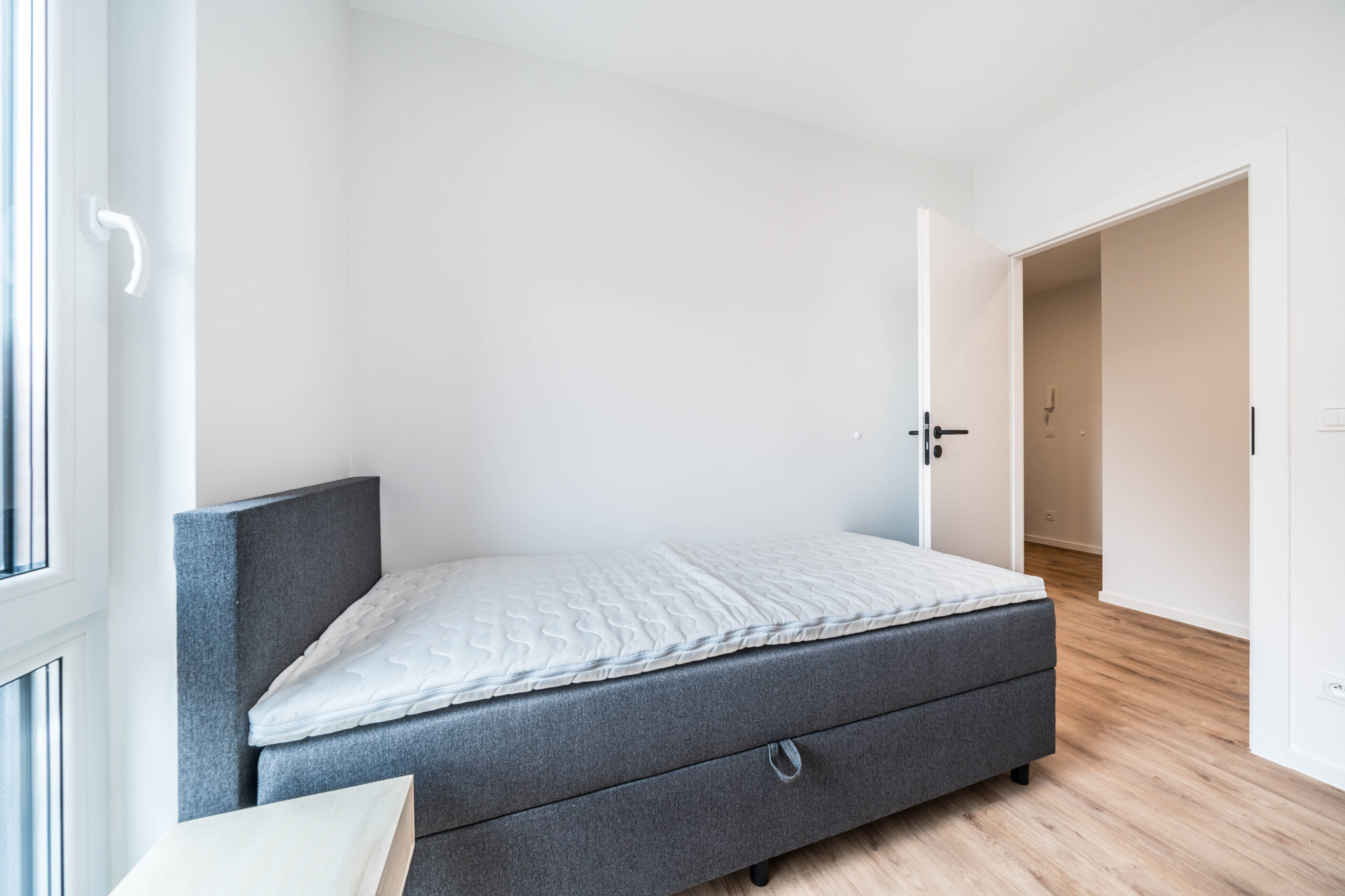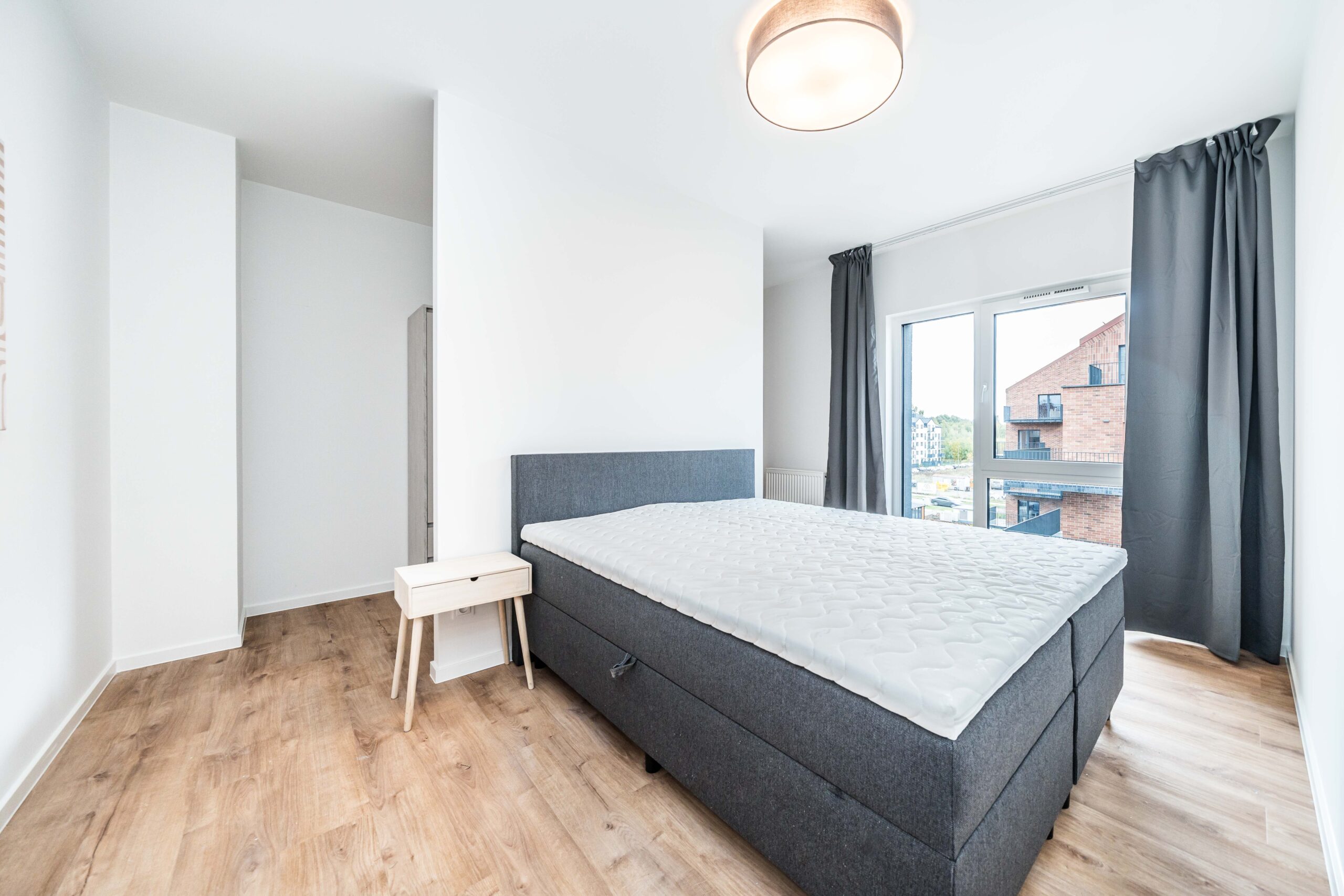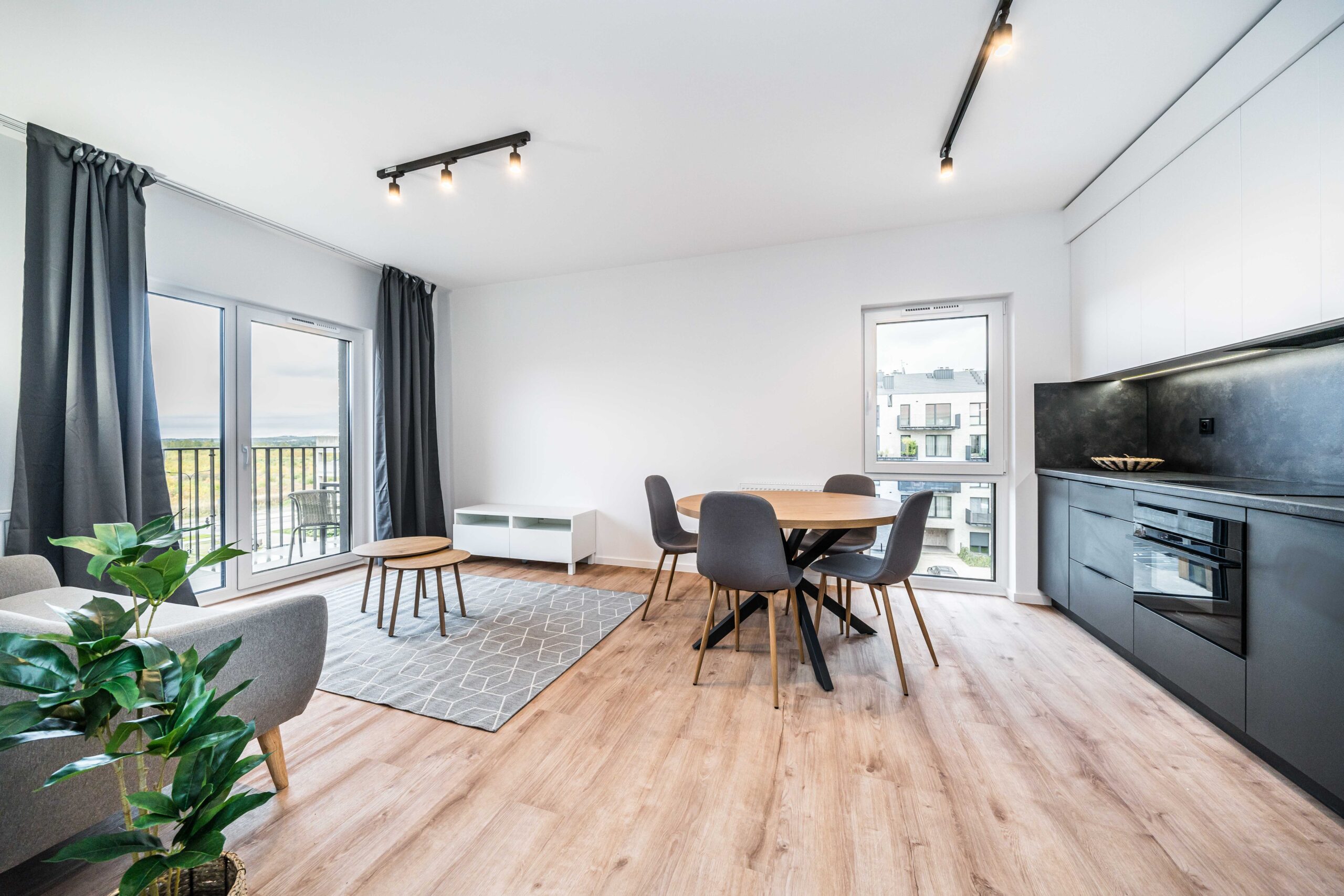 Układ apartamentu obejmuje pokój dzienny z aneksem kuchennym, oddzielną sypialnię, osobną łazienkę z toaletą, niewielki przedpokój oraz bezpośrednie wyjście na prywatny balkon lub taras (w zależności od piętra). Łazienka wyposażona jest w glazurę, wannę/prysznic, grzejnik na ręczniki, toaletę i umywalkę. W kuchni znajdują się: duża lodówka, płyta indukcyjna, piekarnik z funkcją mikrofali, zmywarka oraz okap.